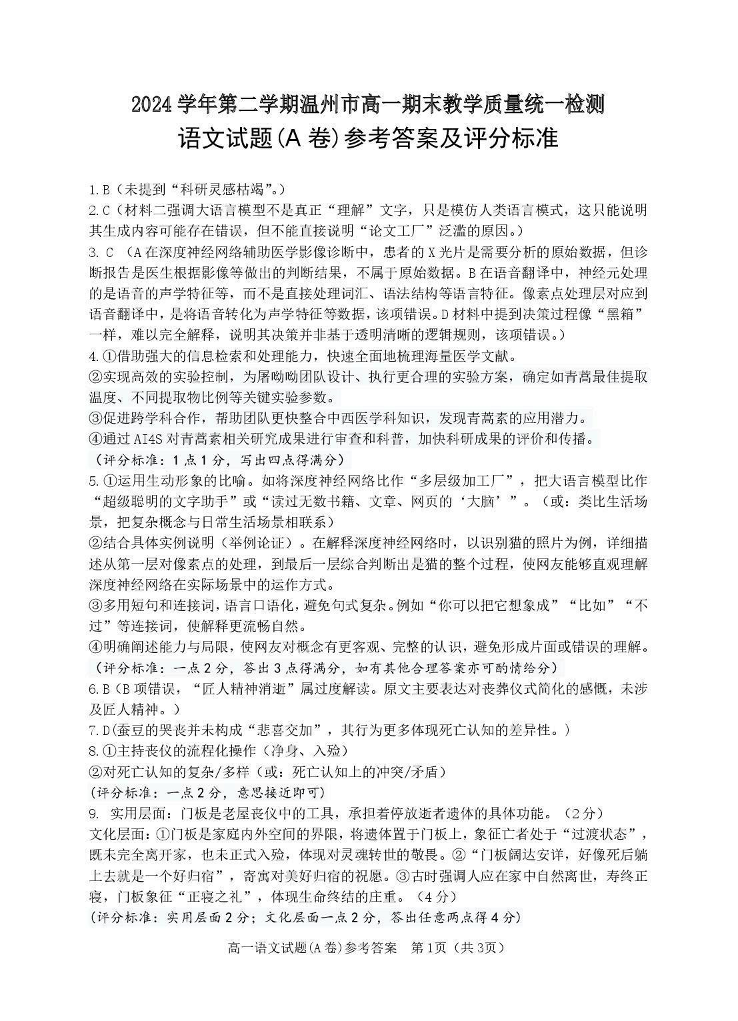 浙江省温州市2024-2025学年下学期6月高一期未语文答案