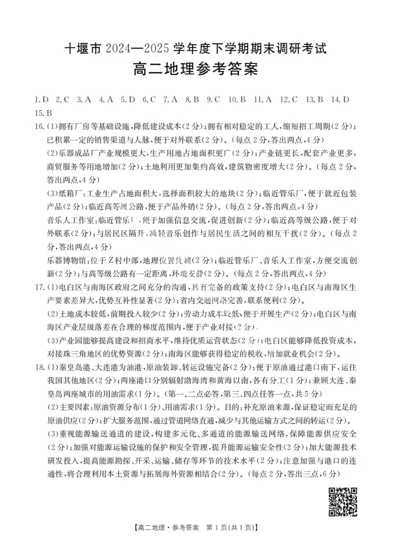 湖北省十堰市 2024-2025学年度下学期高二期末调研地理答案