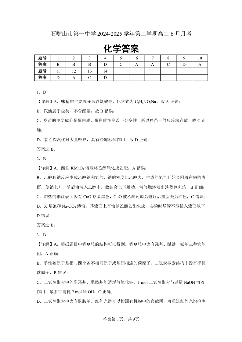宁夏回族自治区石嘴山市一中2024-2025学年下学期6月高二月考化学答案