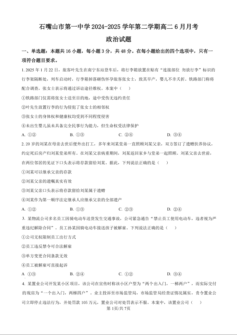 宁夏回族自治区石嘴山市一中2024-2025学年下学期6月高二月考政治(原卷版)