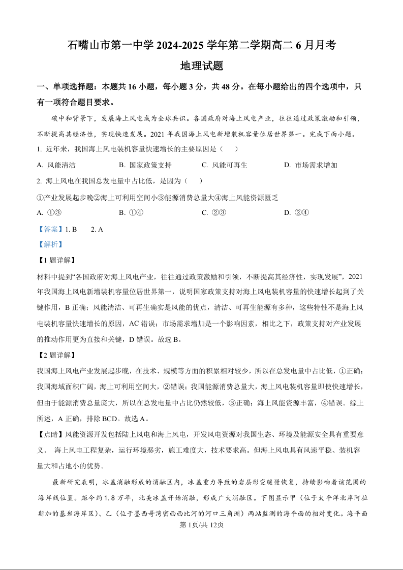 宁夏回族自治区石嘴山市一中2024-2025学年下学期6月高二月考地理(精品解析版)