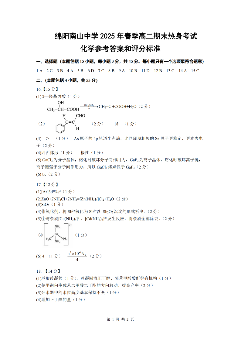 四川省绵阳南山中学2024-2025学年下学期6月高二期末热身化学答案