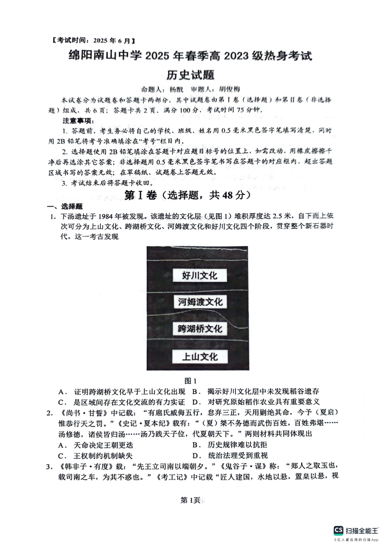 四川省绵阳南山中学2024-2025学年下学期6月高二期末热身历史+答案