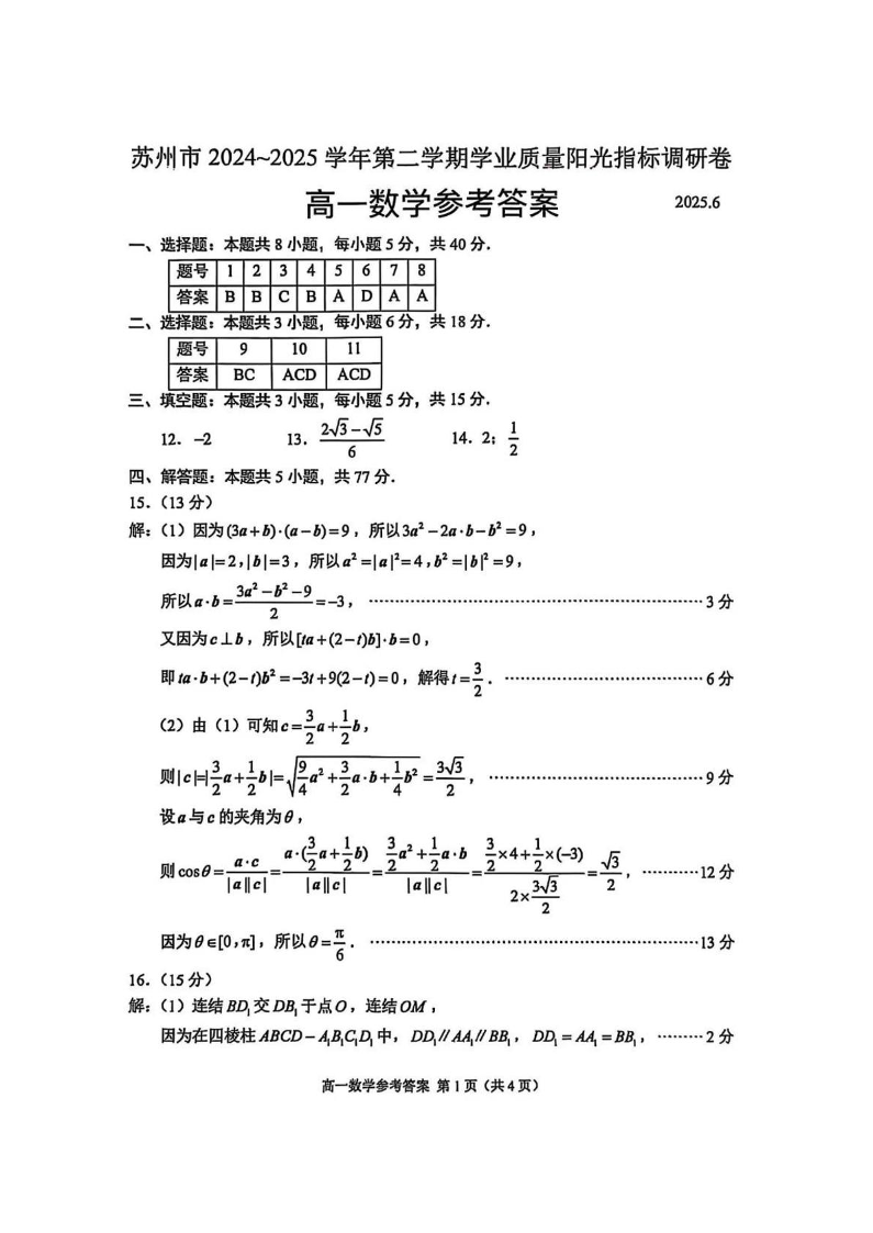 江苏省苏州市2024-2025学年高一下学期学业质量阳光指标调研数学答案