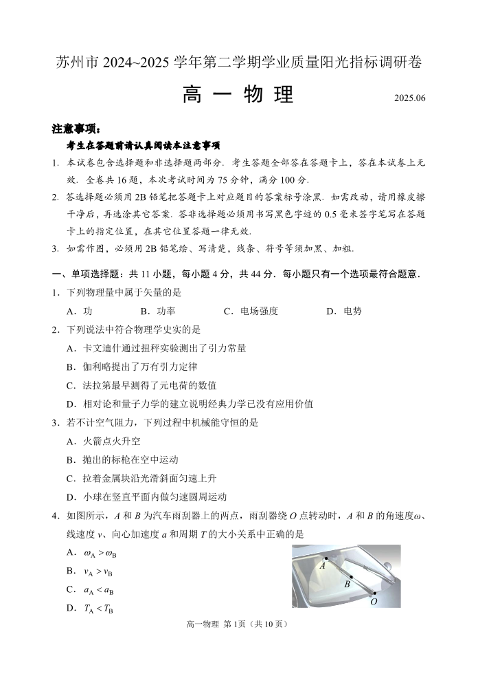 江苏省苏州市2024-2025学年高一下学期学业质量阳光指标调研物理+答案