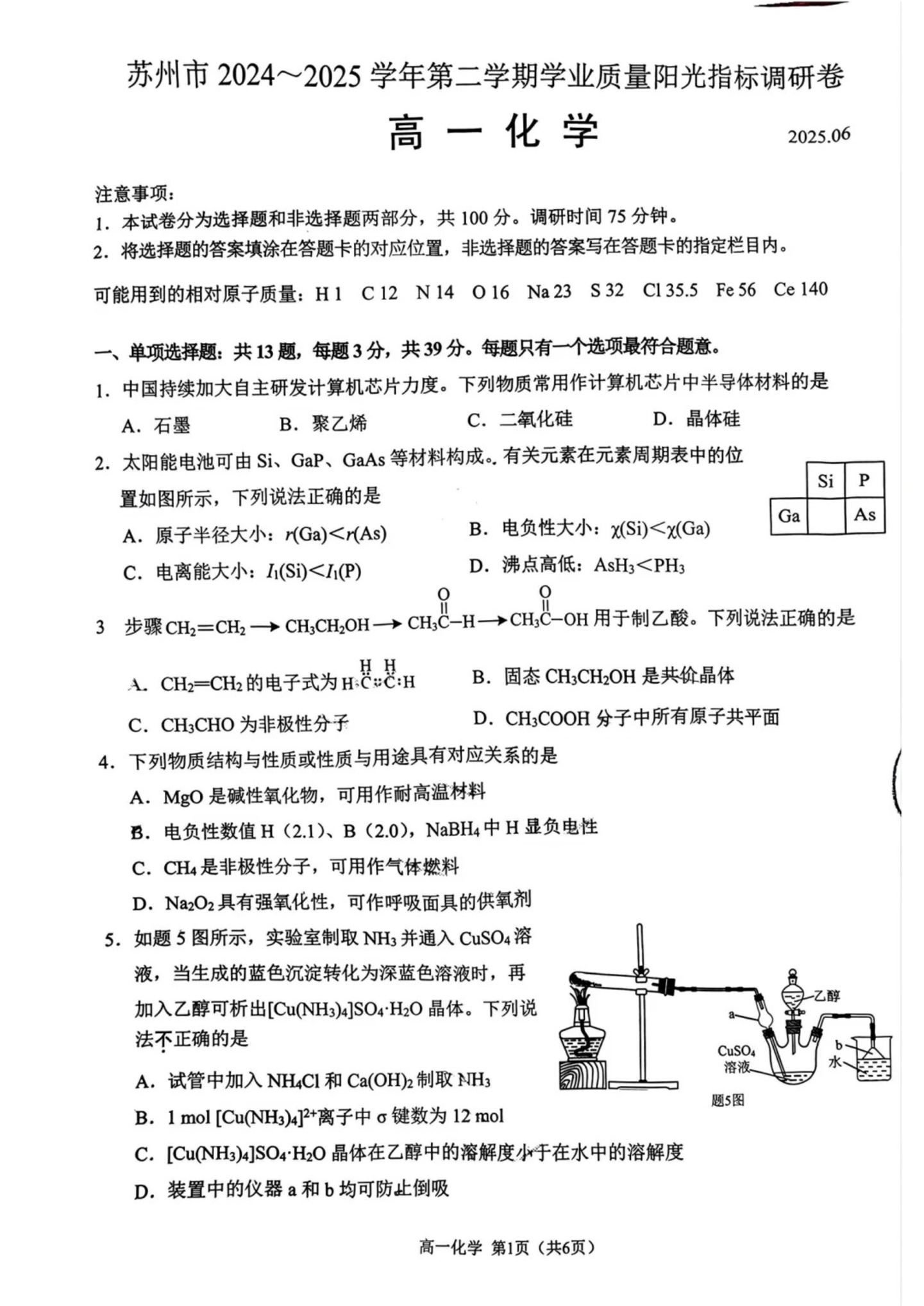 江苏省苏州市2024-2025学年高一下学期学业质量阳光指标调研化学
