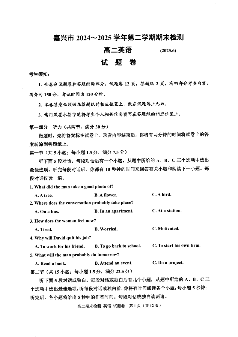 浙江省嘉兴市2024~2025学年第二学期高二期末检测英语