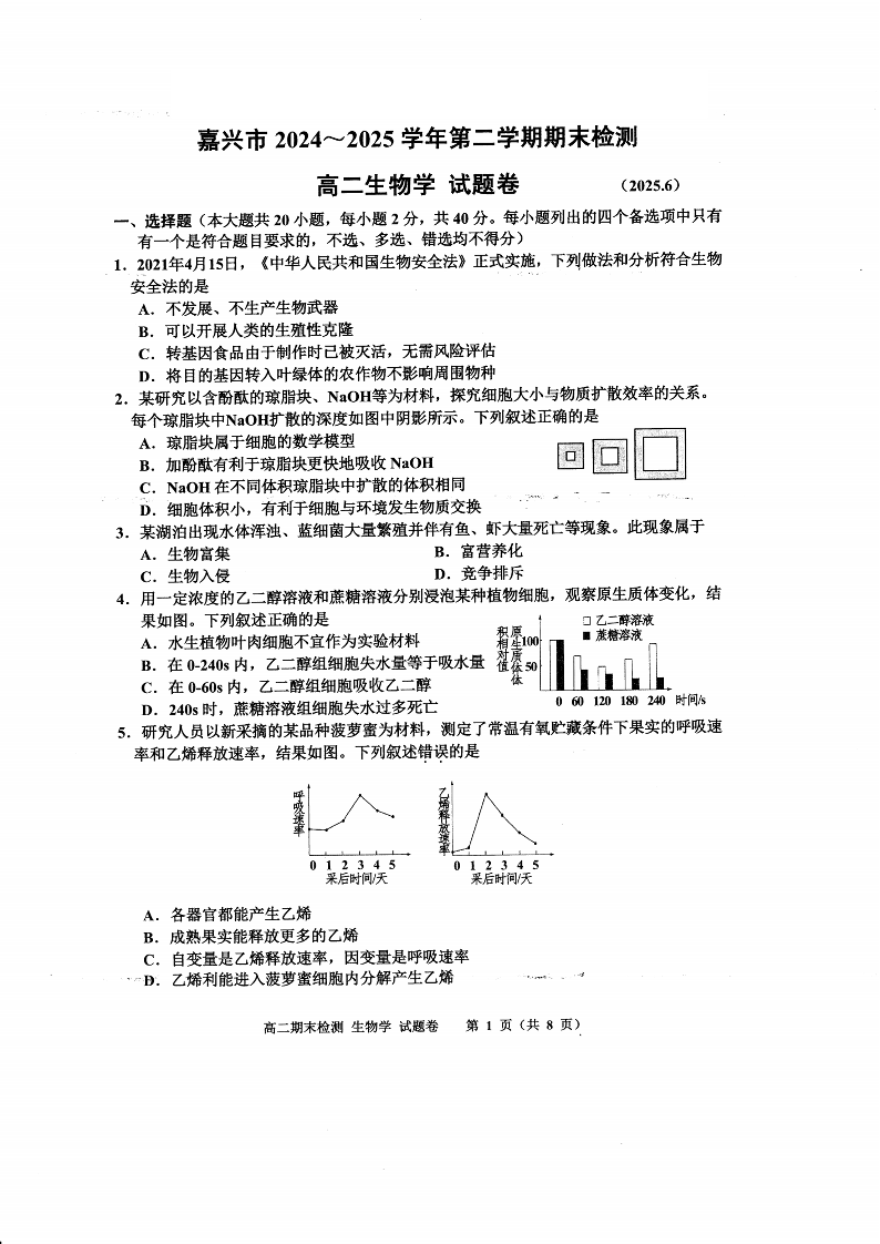 浙江省嘉兴市2024~2025学年第二学期高二期末检测生物