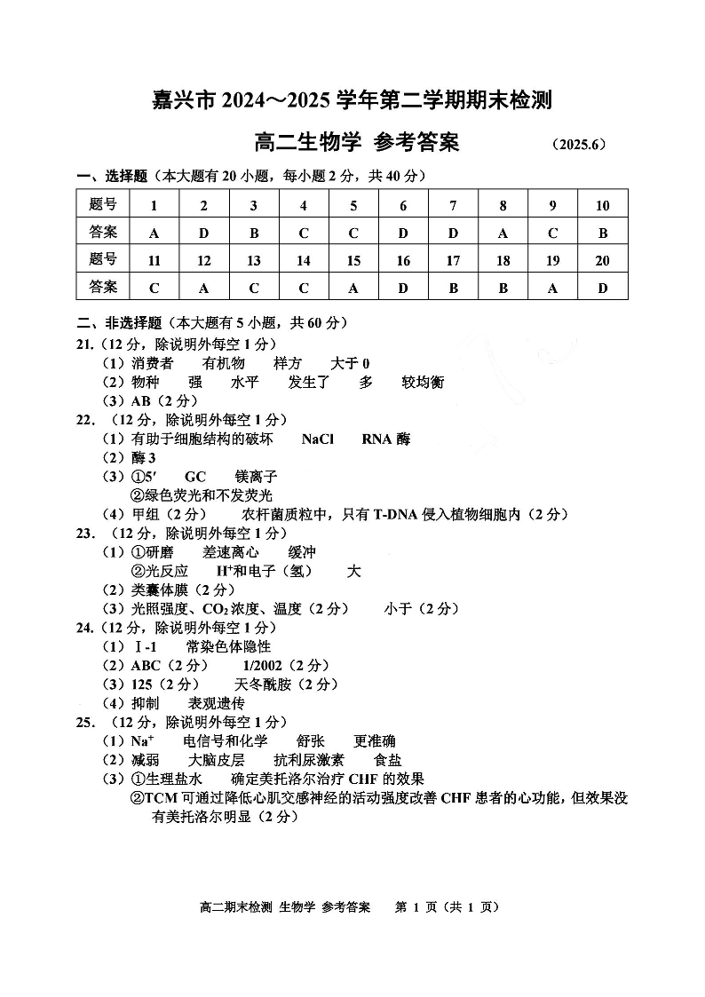 浙江省嘉兴市2024~2025学年第二学期高二期末检测生物答案