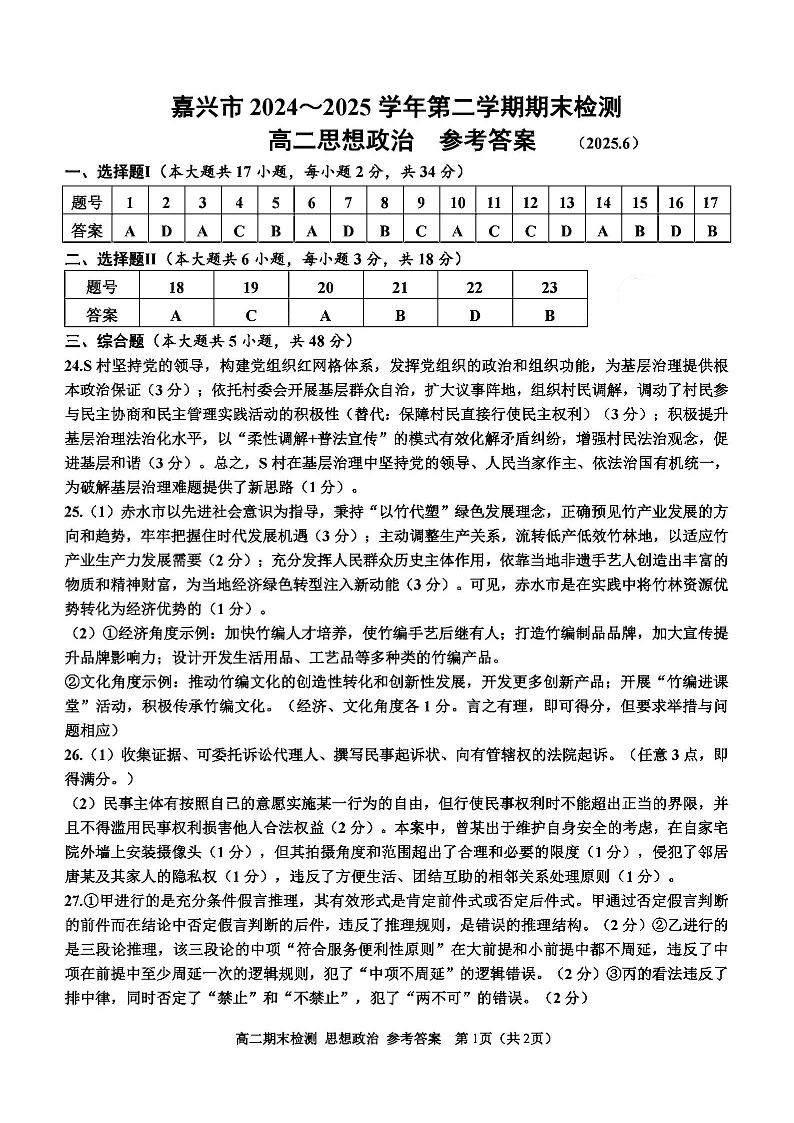 浙江省嘉兴市2024~2025学年第二学期高二期末检测政治答案