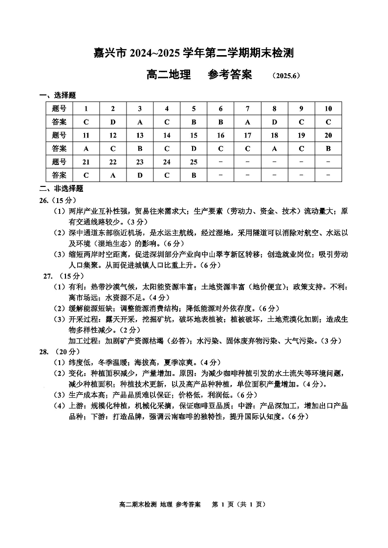 浙江省嘉兴市2024~2025学年第二学期高二期末检测地理答案