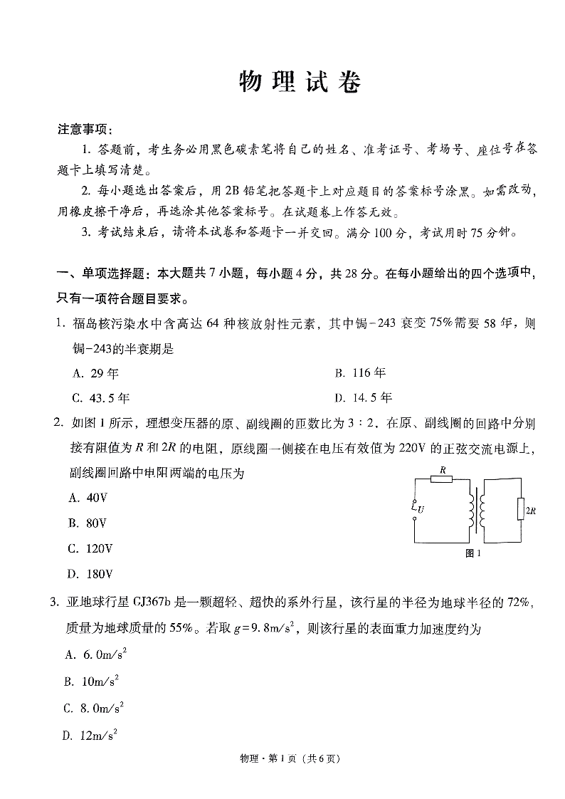 贵州省贵阳市第一中学2024届高三适应性月考(八)物理