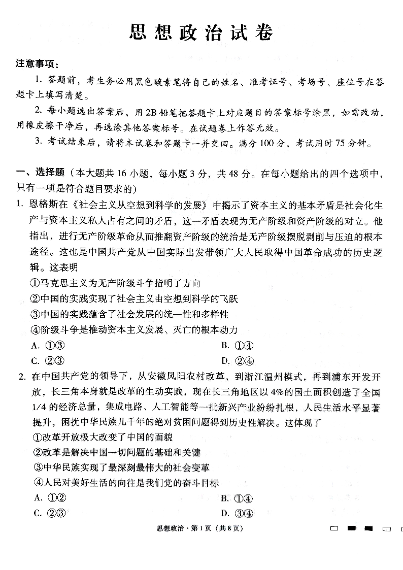 贵州省贵阳市第一中学2024届高三适应性月考(八)政治
