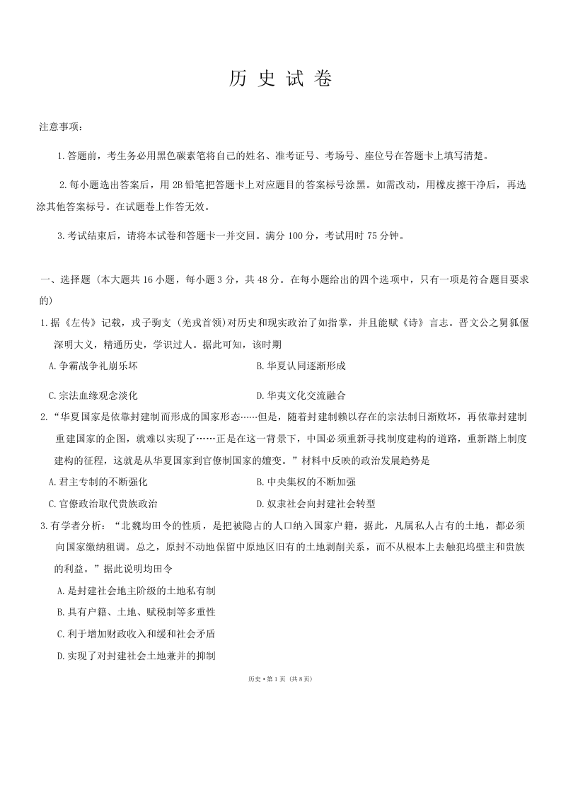 贵州省贵阳市第一中学2024届高三适应性月考(八)历史