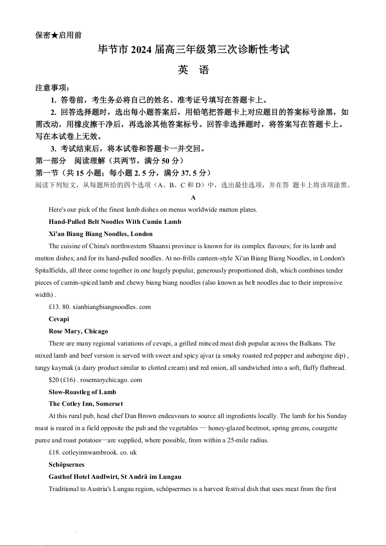 贵州省毕节市2024届高三第三次诊断性考试英语+答案