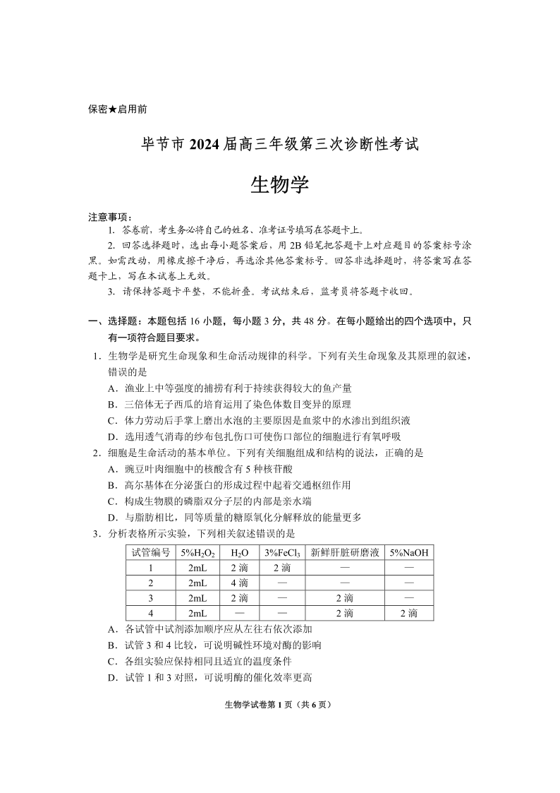 贵州省毕节市2024届高三第三次诊断性考试生物