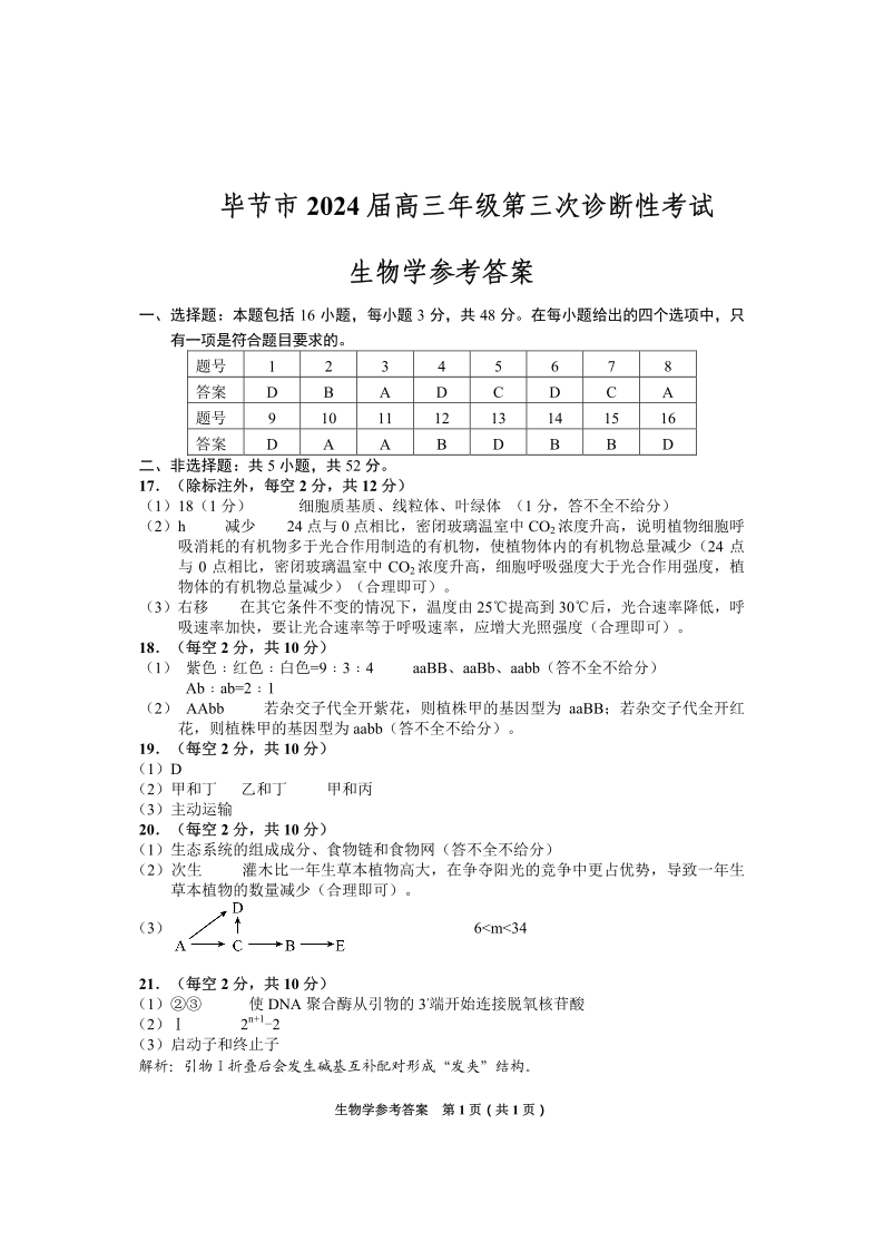 贵州省毕节市2024届高三第三次诊断性考试生物答案