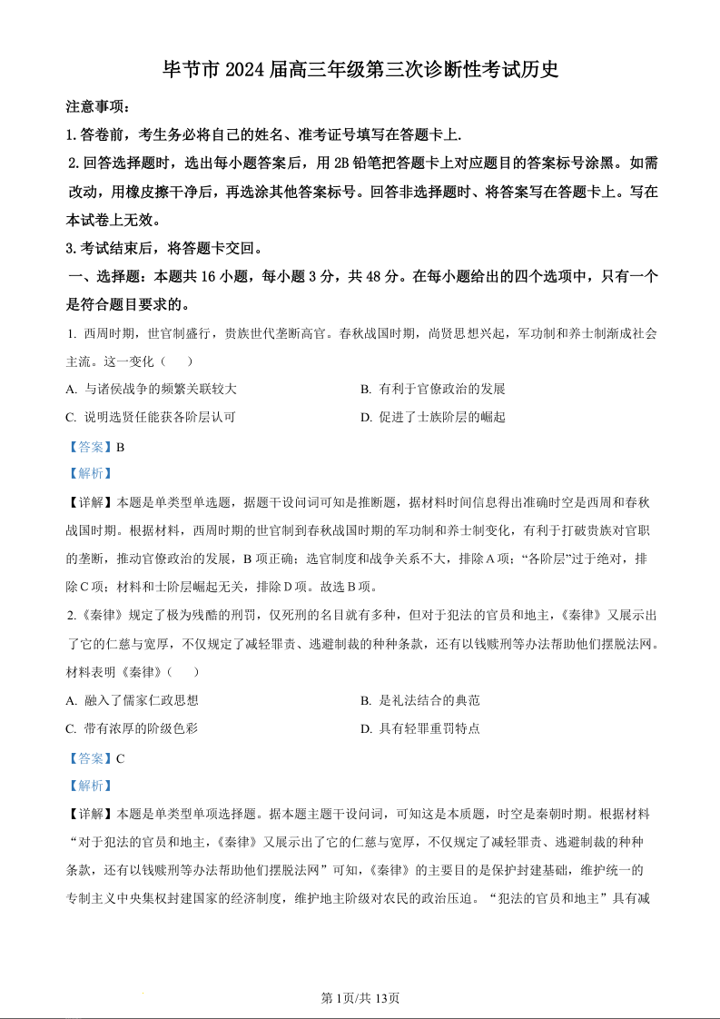 贵州省毕节市2024届高三第三次诊断性考试历史(精品解析版)