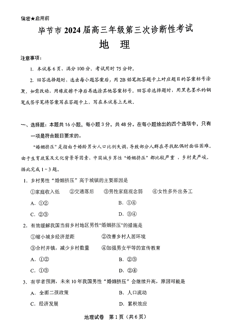 贵州省毕节市2024届高三第三次诊断性考试地理