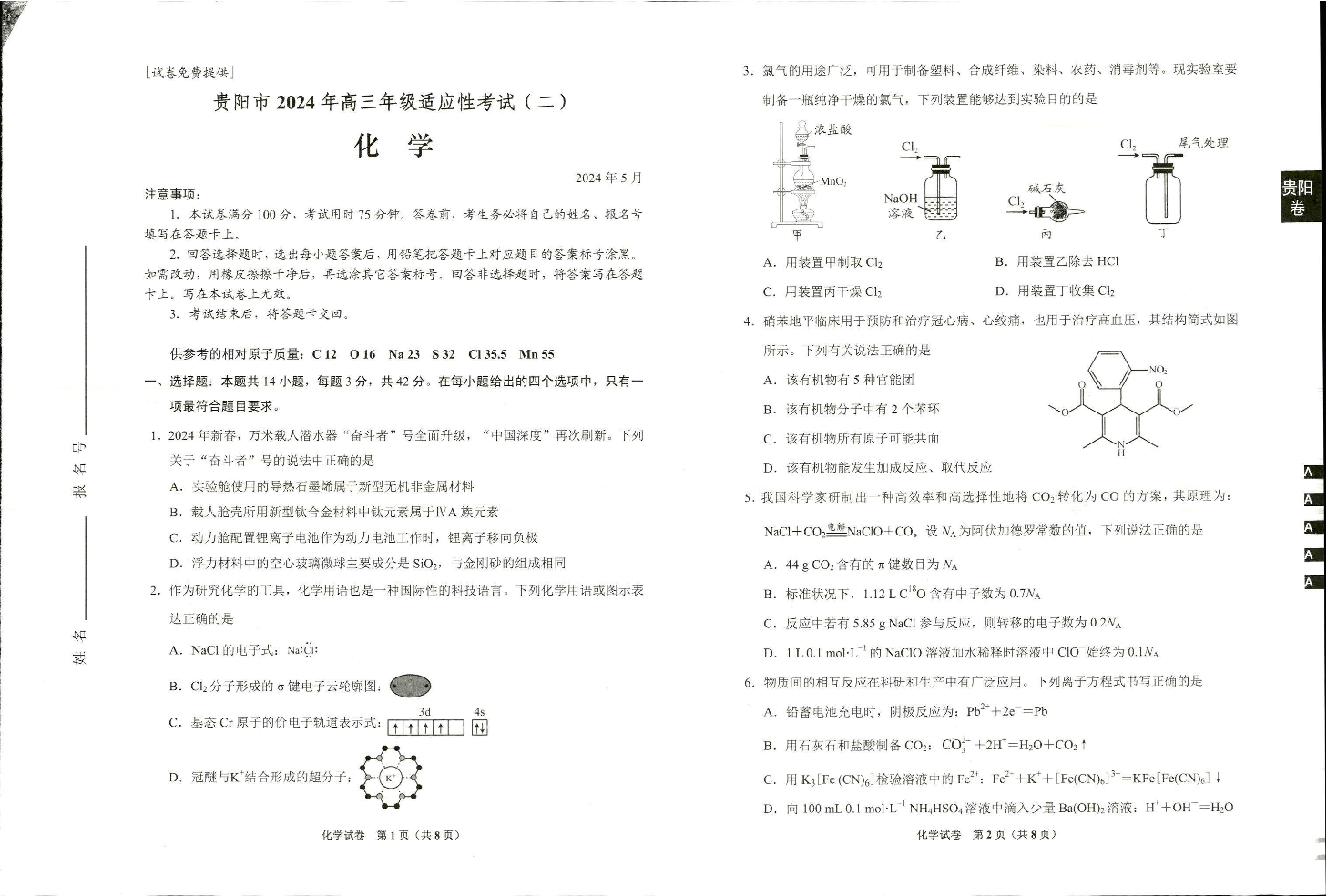 贵州省贵阳市2024届高三5月适应性考试(二)化学