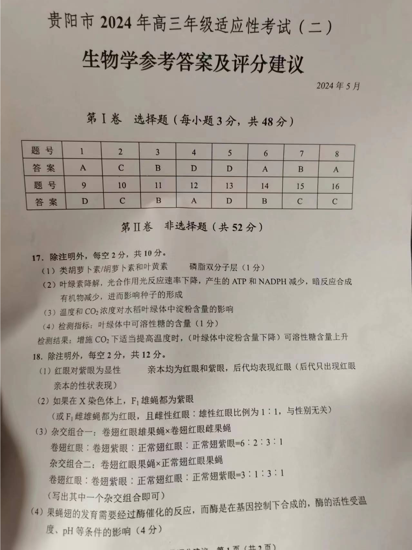 贵州省贵阳市2024届高三5月适应性考试(二)生物答案