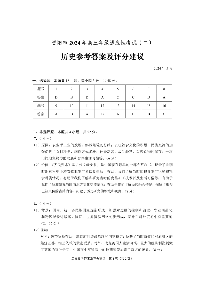 贵州省贵阳市2024届高三5月适应性考试(二)历史答案