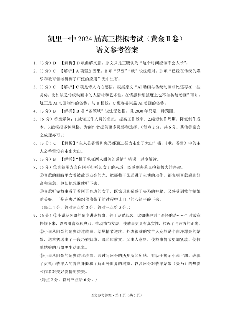 贵州省凯里市第一中学2024届高三三模(黄金二卷)语文答案
