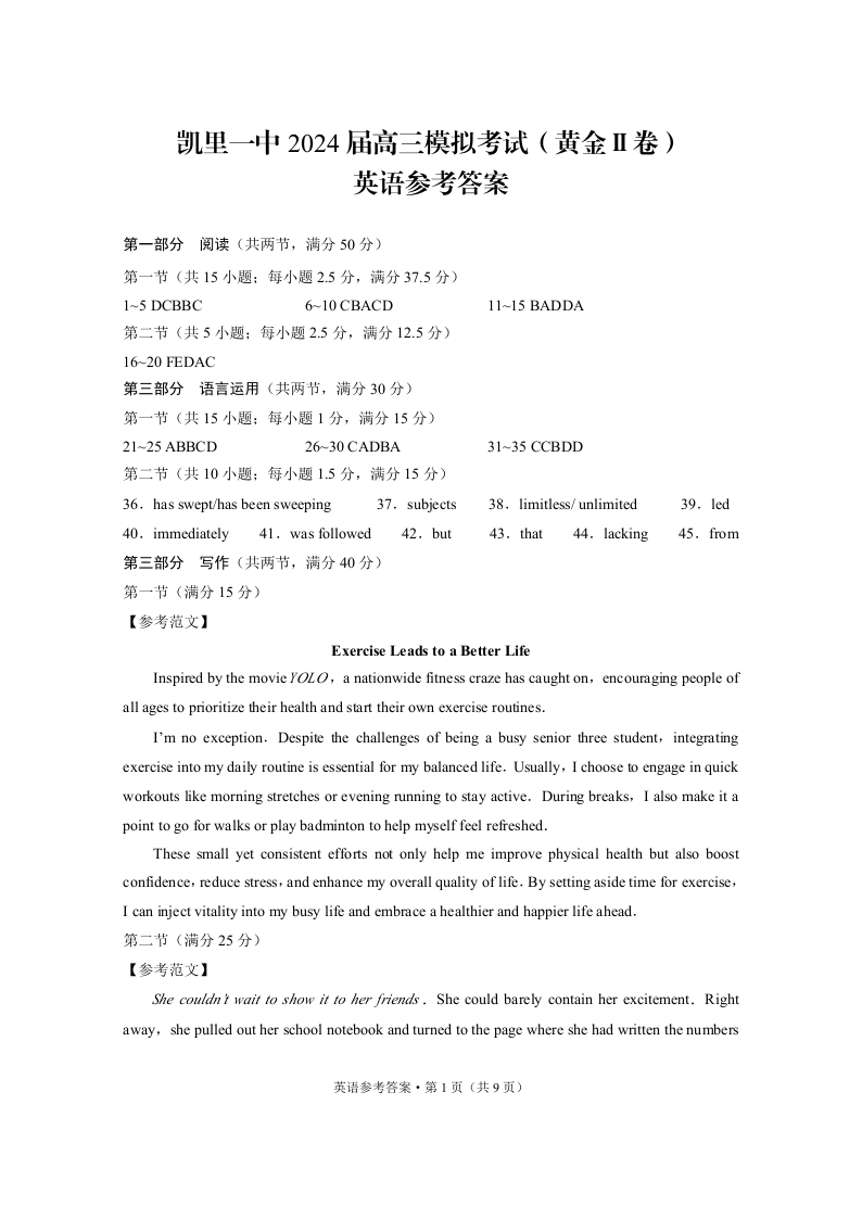 贵州省凯里市第一中学2024届高三三模(黄金二卷)英语答案