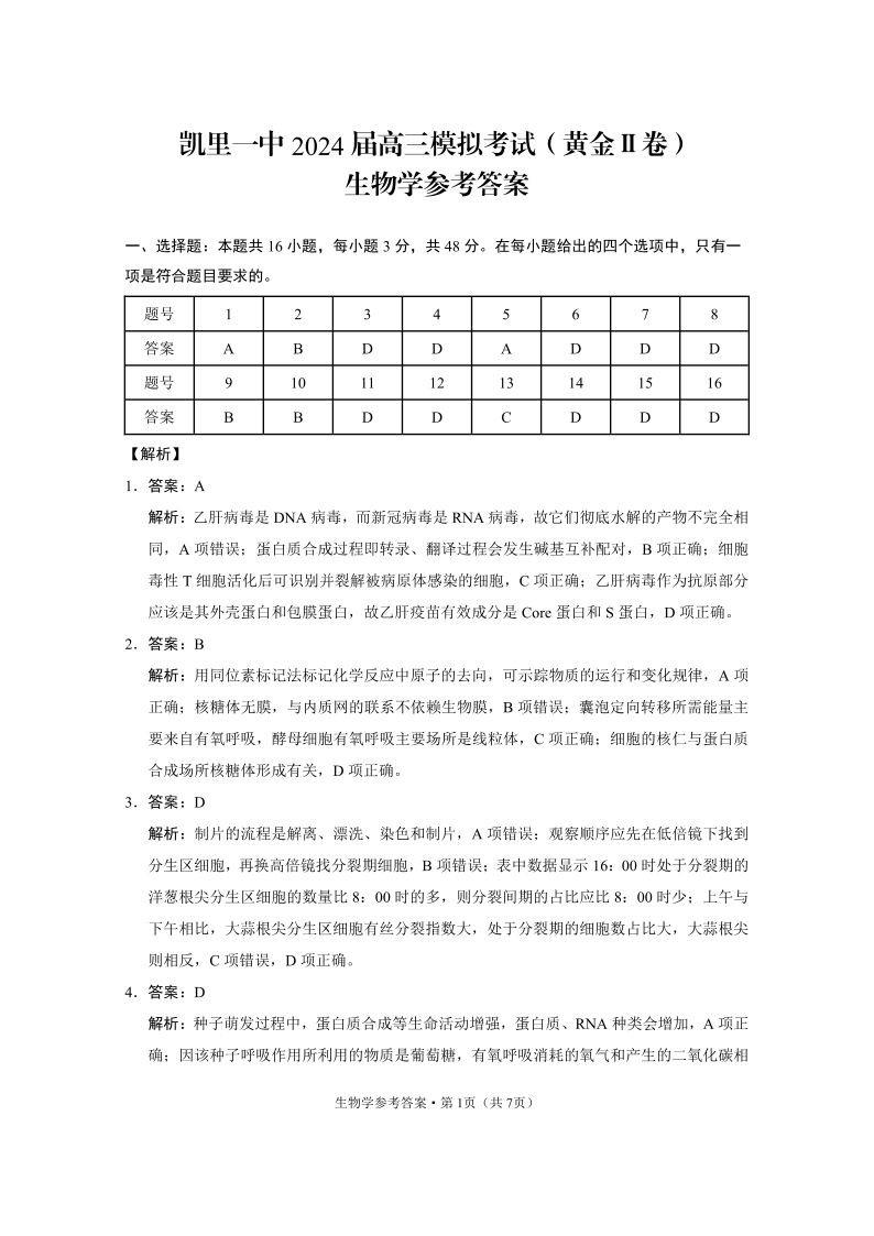 贵州省凯里市第一中学2024届高三三模(黄金二卷)生物答案