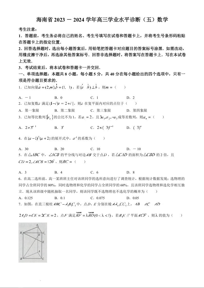 海南省天一联考高三学业水平诊断(五)数学+答案