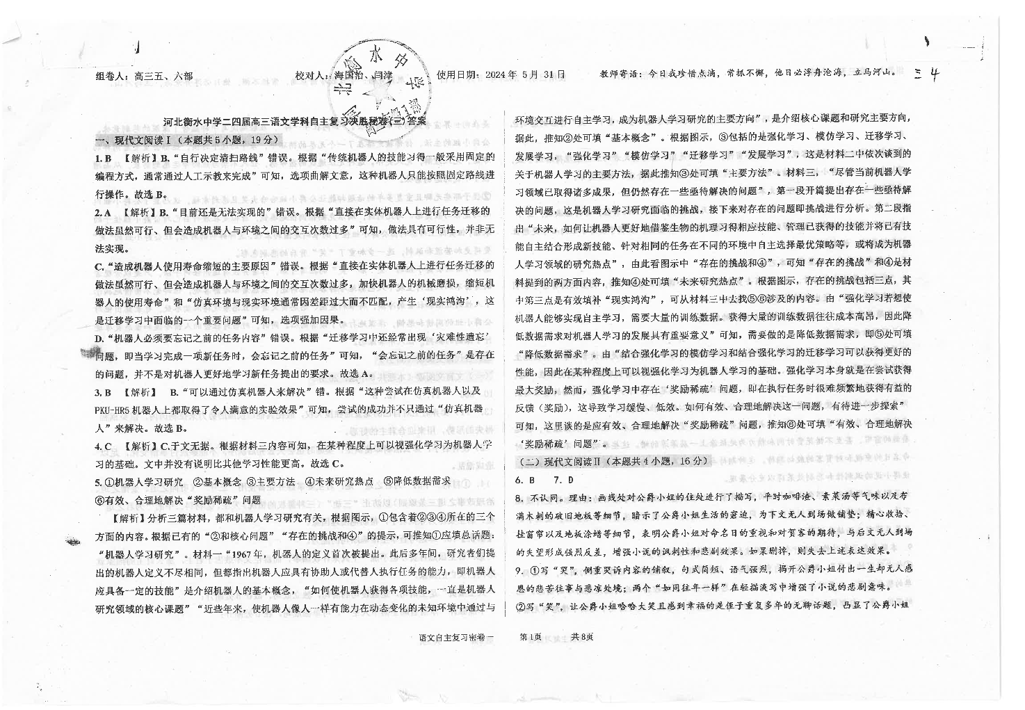 河北省衡水中学2024届高三下学期高考押题密卷(三)语文答案