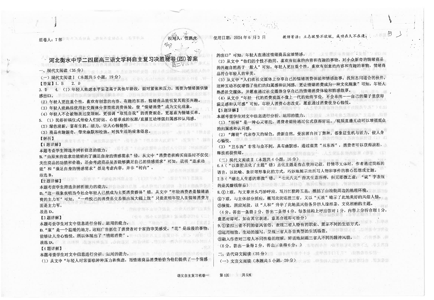 河北省衡水中学2024届高三下学期高考押题密卷(四)语文答案
