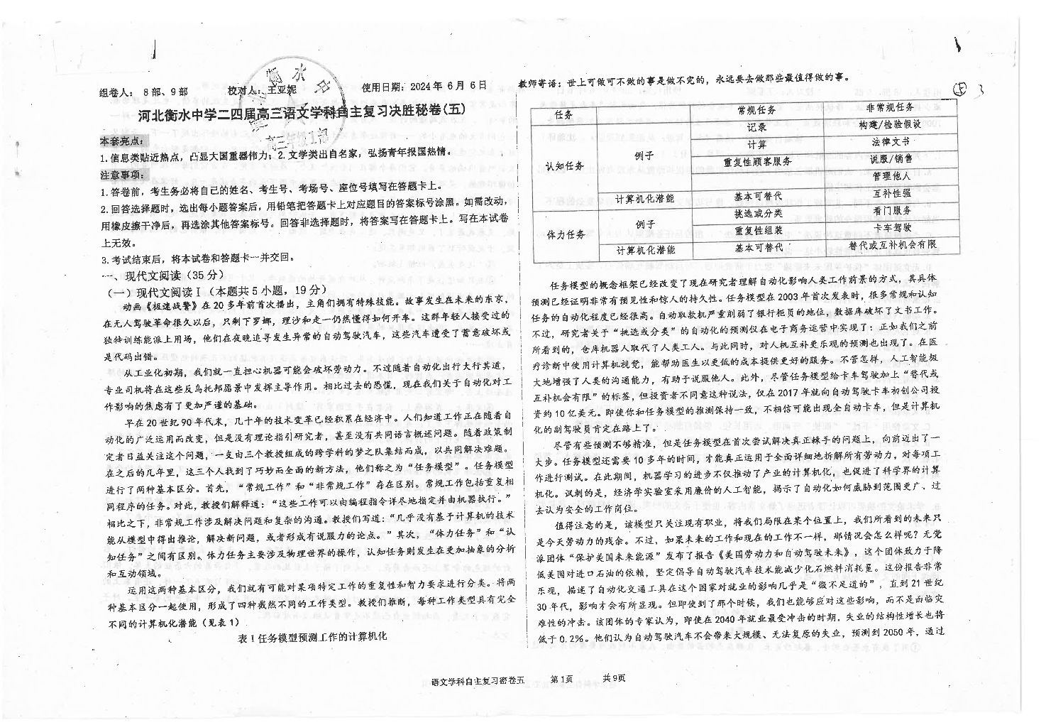 河北省衡水中学2024届高三下学期高考押题密卷(五)语文