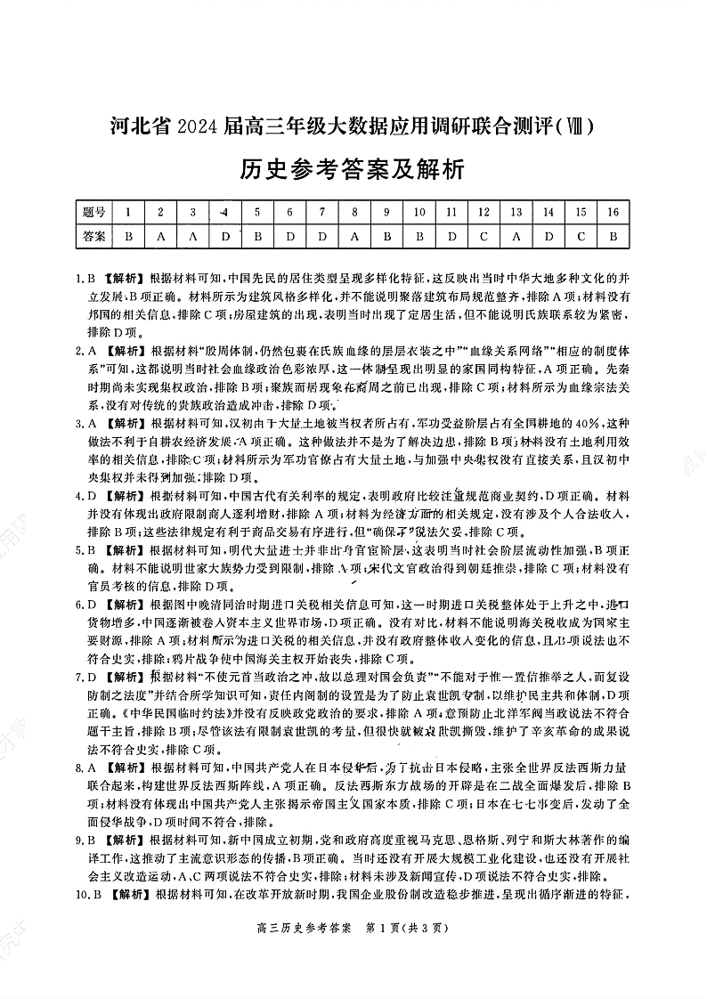 河北省2024届高三下学期大数据应用调研联合测评历史答案