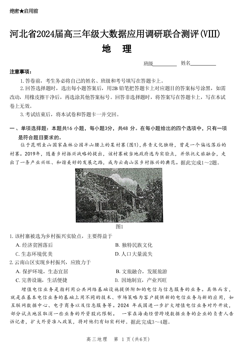 河北省2024届高三下学期大数据应用调研联合测评地理