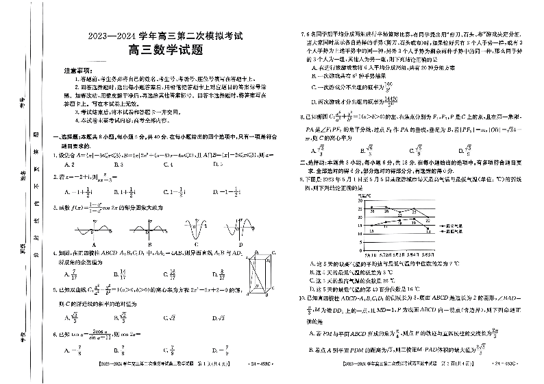 河北省保定市2024届高三二模数学