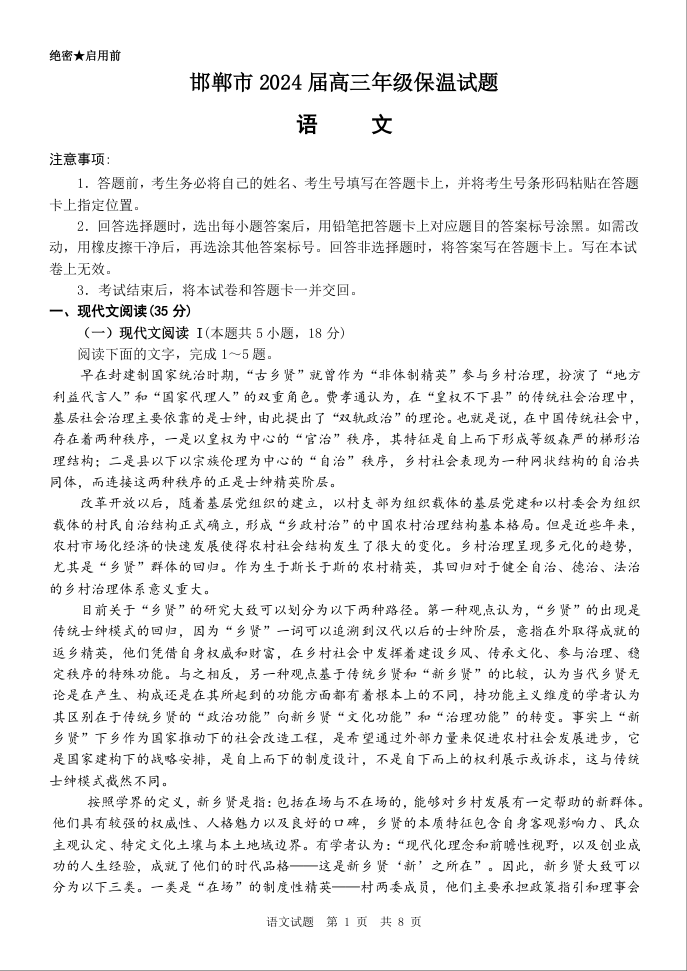 河北省邯郸市2024届高三下学期5月保温卷语文
