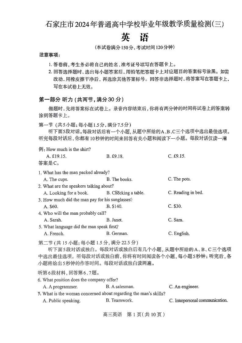 河北省石家庄市2024届高三教学质量检测(三)英语