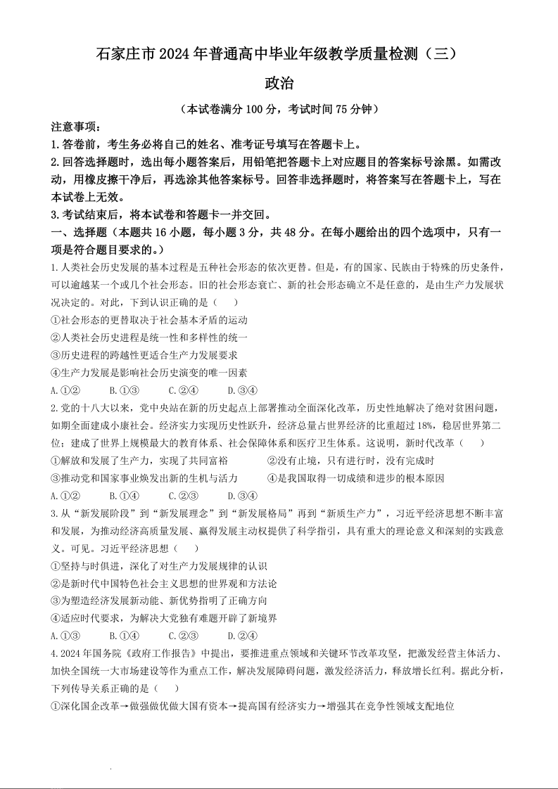 河北省石家庄市2024届高三教学质量检测(三)政治+答案