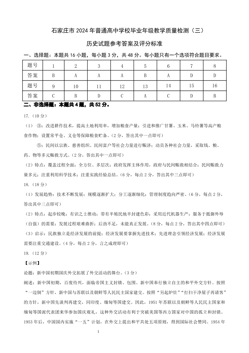 河北省石家庄市2024届高三教学质量检测(三)历史答案