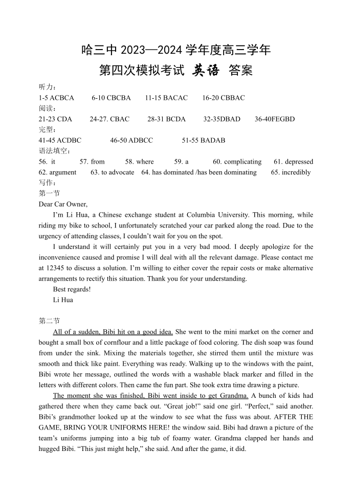 黑龙江哈尔滨第三中学2024届高三上学期第四次模拟考英语答案