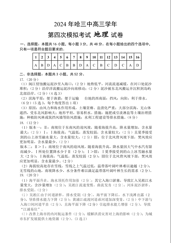 黑龙江哈尔滨第三中学2024届高三上学期第四次模拟考地理答案