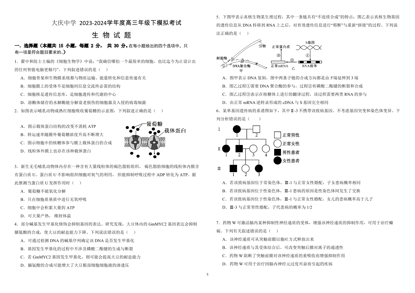 黑龙江省大庆市大庆中学2024届高三5月期中考试生物