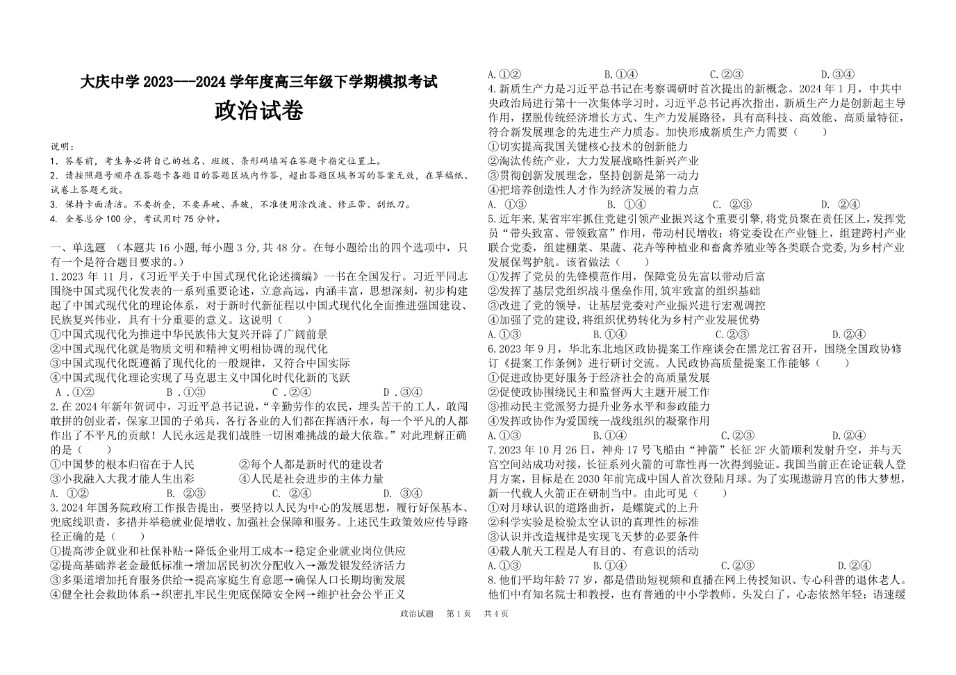 黑龙江省大庆市大庆中学2024届高三5月期中考试政治