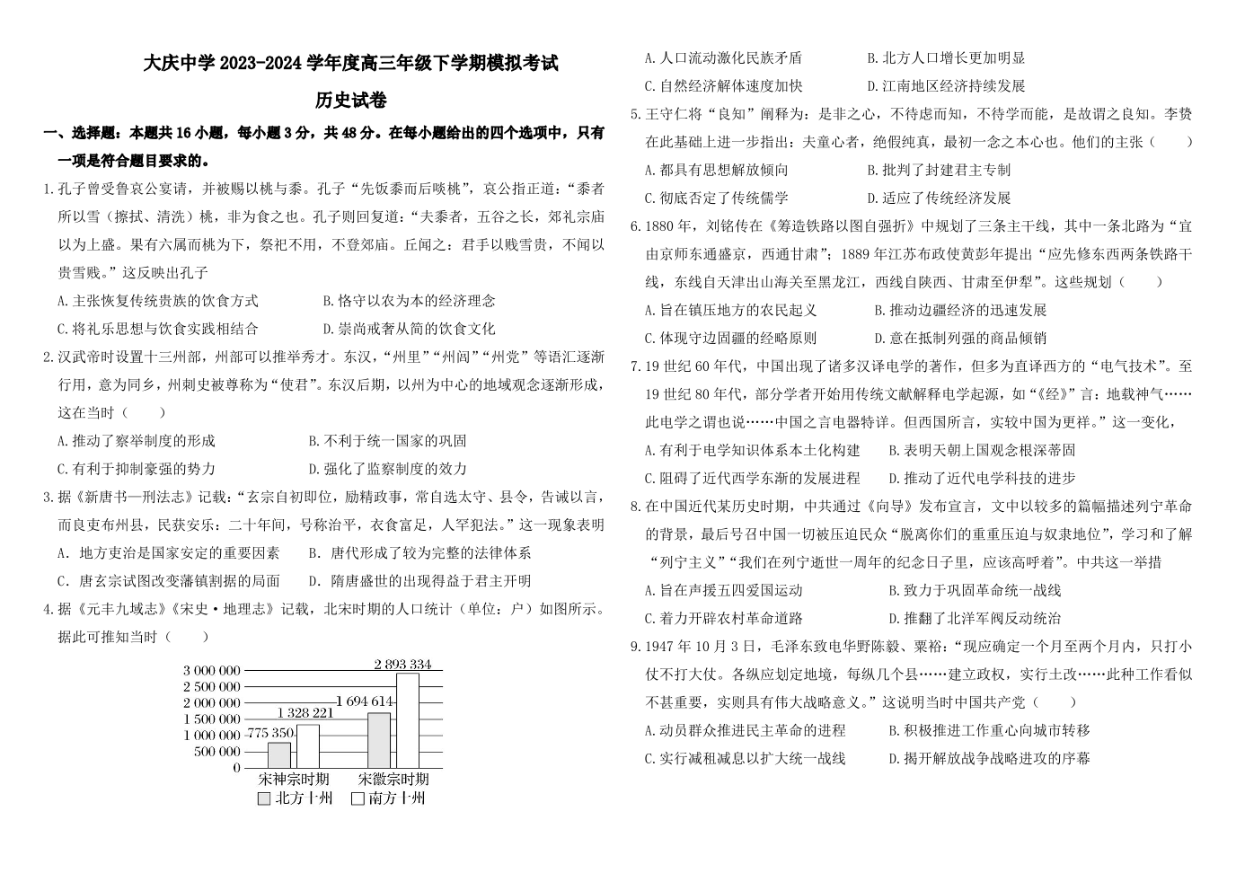 黑龙江省大庆市大庆中学2024届高三5月期中考试历史