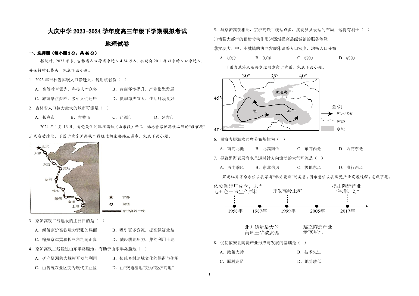 黑龙江省大庆市大庆中学2024届高三5月期中考试地理