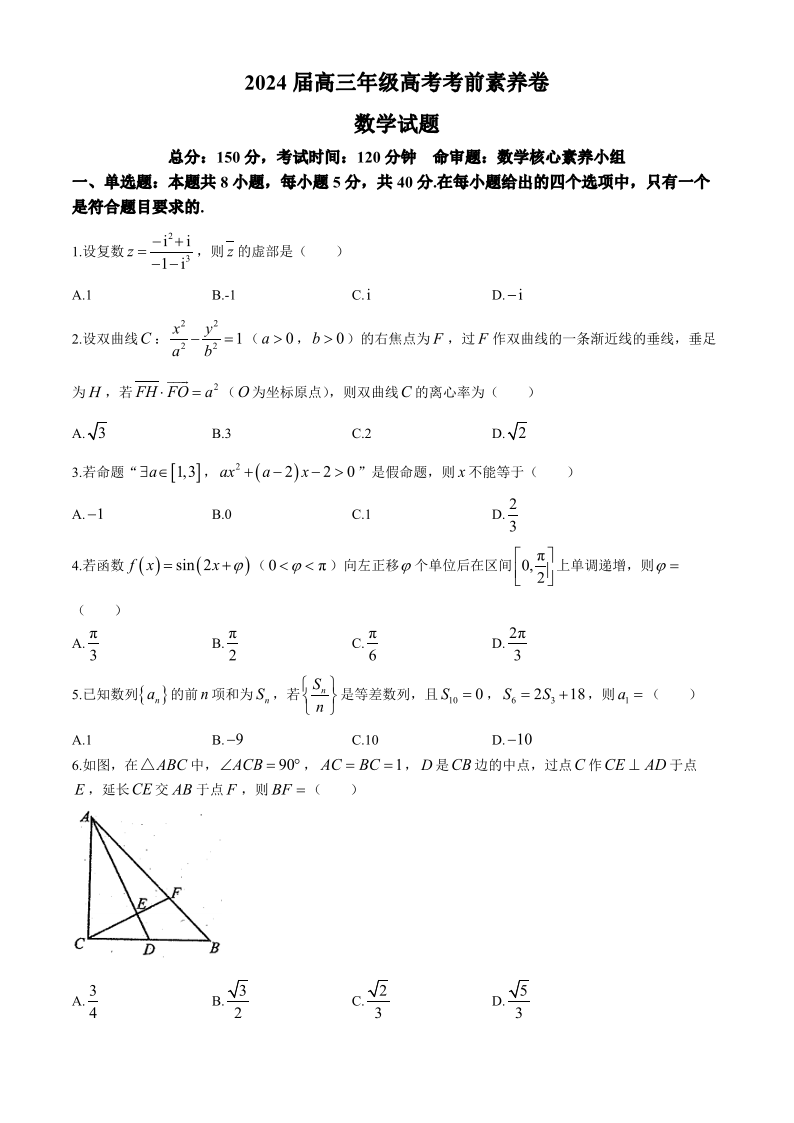 湖北省武汉市华中师范大学第一附属中学高三考前素养测试卷数学+答案