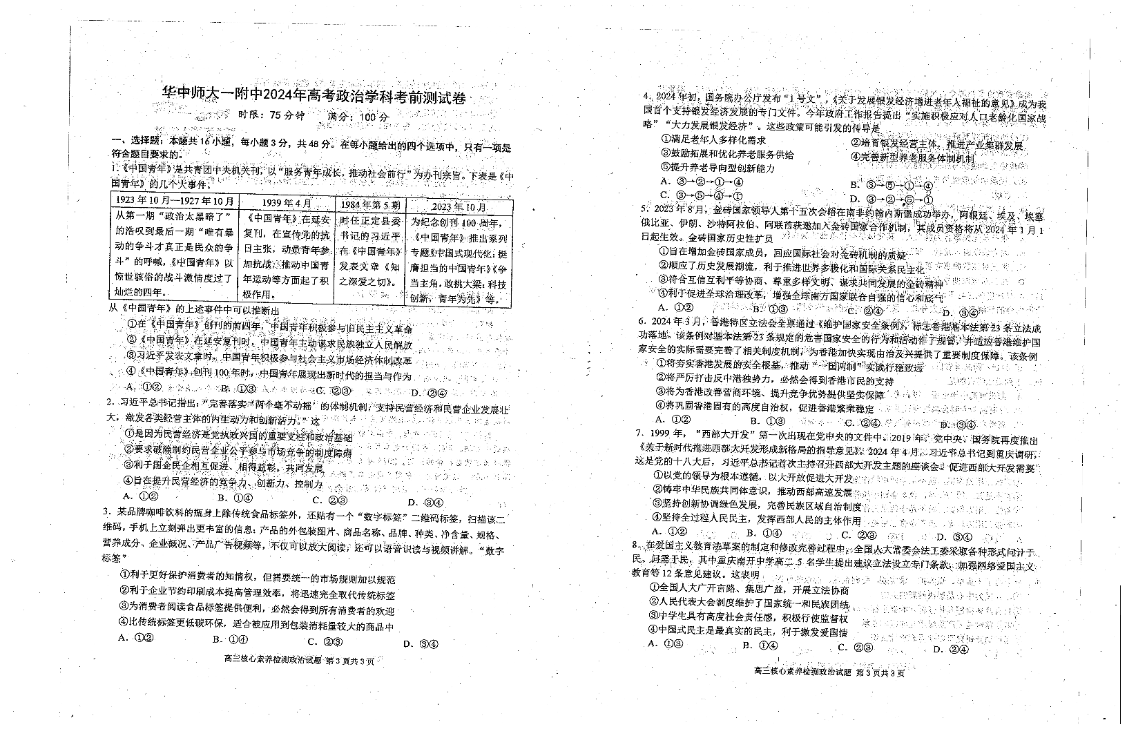 湖北省武汉市华中师范大学第一附属中学高三考前素养测试卷政治