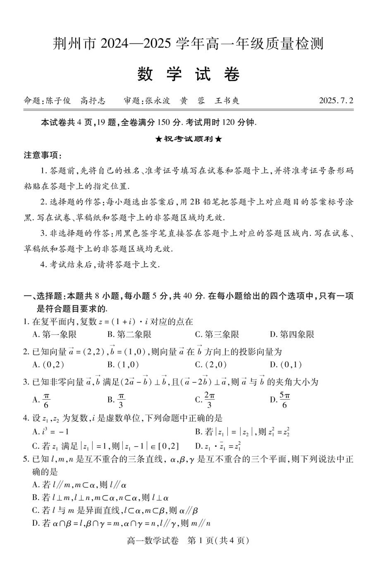 湖北省荆州市2024一2025学年高一年级质量检测数学