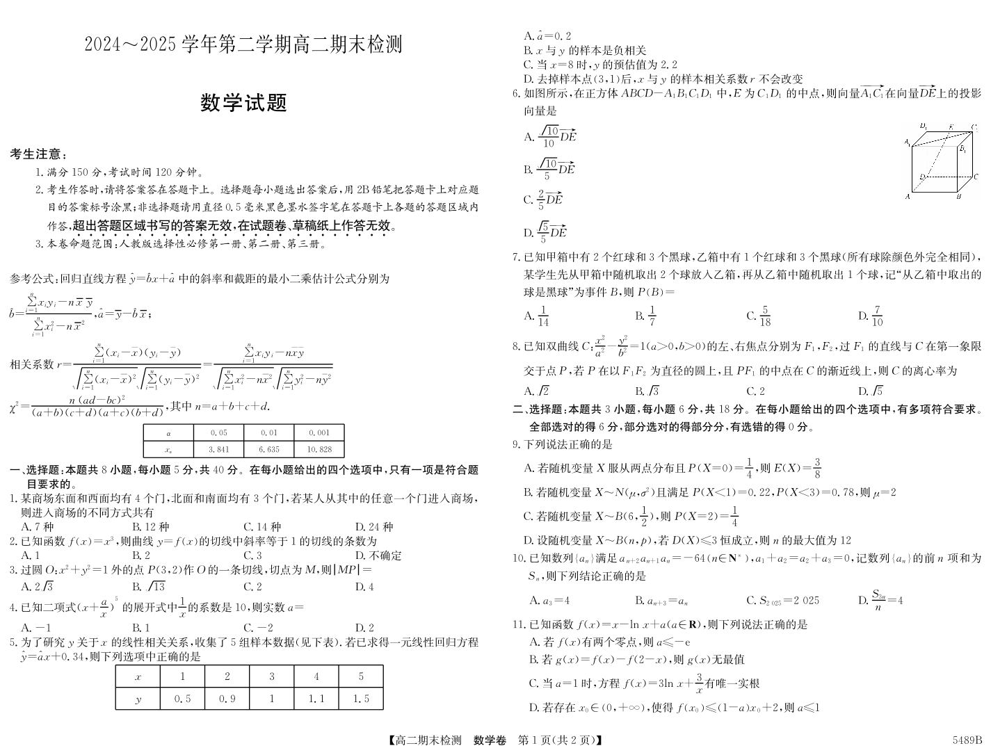 安徽省县中联盟2024-2025学年第二学期高二期末检测数学